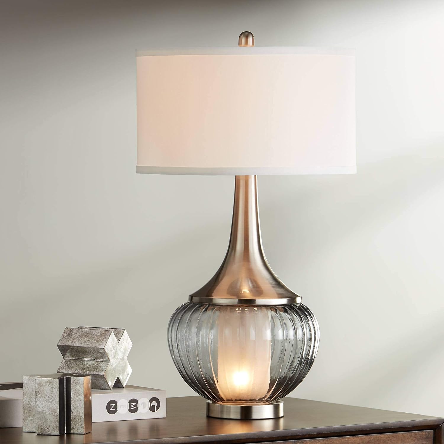 Shop smoked glass table lamp at urban outfitters today. Crafted of glass smoke gray finish cylindrical cut glass patterned base with slim stem hardback drum shade in gray fabric shade measures 6.5h x 6 in. The smokey grey glass has a graduated ombre effect, fading from deep grey at the base to clear at the top.click here to. Clear glass table lamp with white fabric shade.